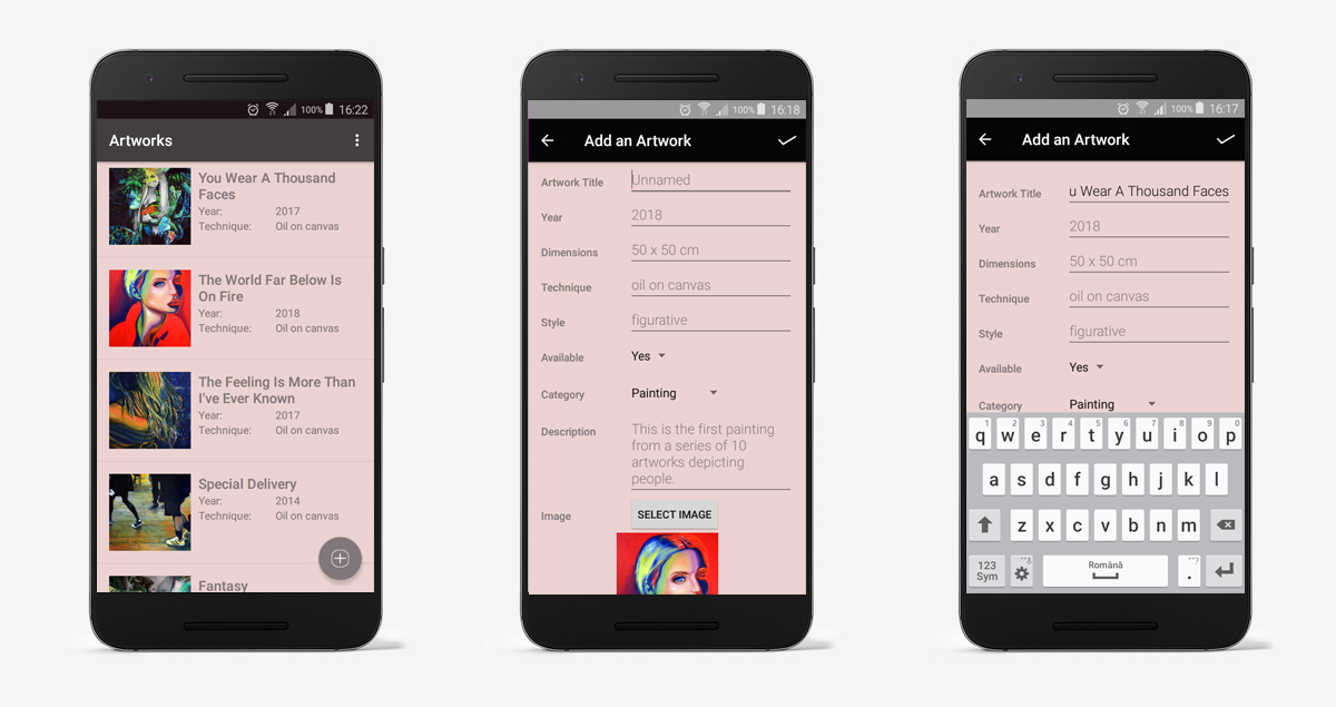 Keep track of your creations with this simple app. Add photos and details to have an organized list of your artworks. You can set the title, the technique, details, dimensions and availability. Whenever you meet someone you will have a fast portfolio to show to people you encounter.